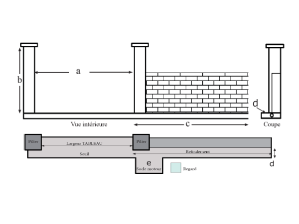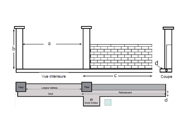 e) Une surface en déport du seuil peut être prévue pour recevoir une future motorisation ou la fixation d’un poteau guide, celle-ci se situe dans l’alignement du pilier côté du refoulement.